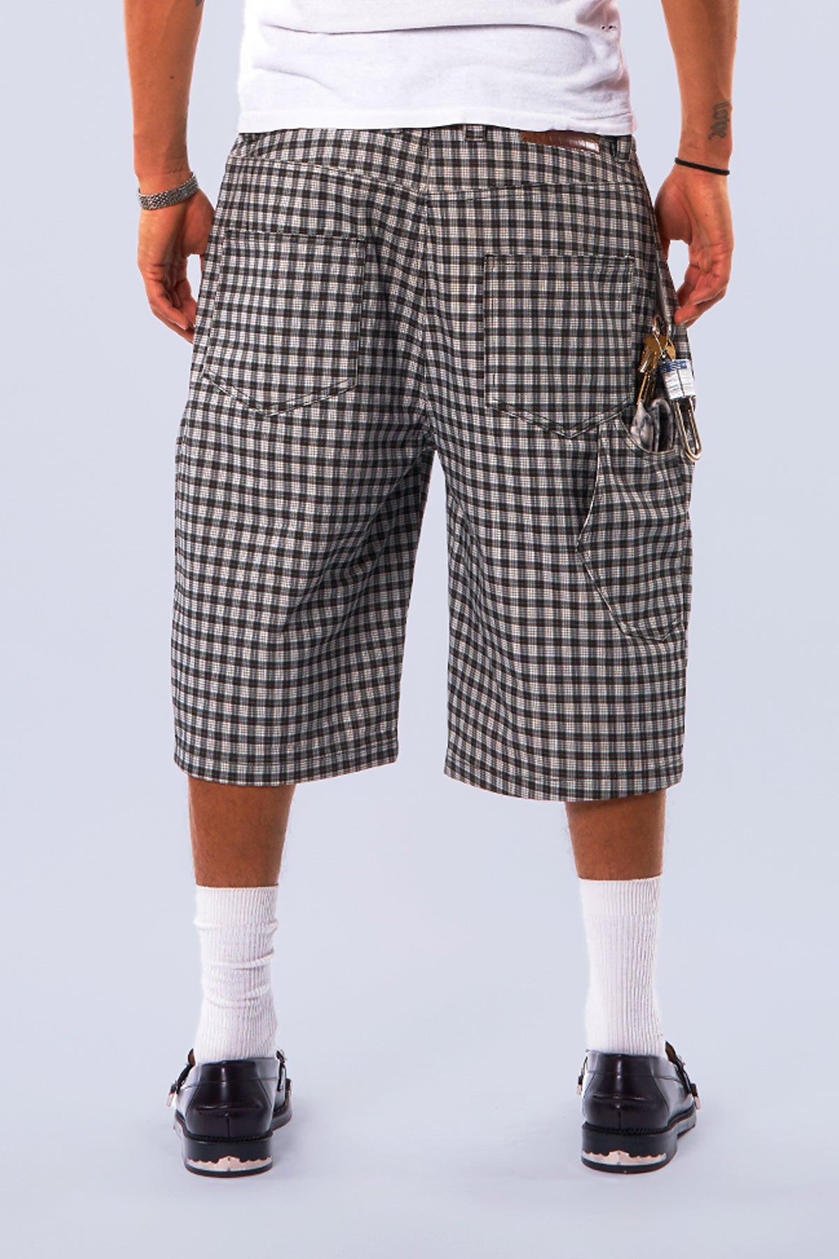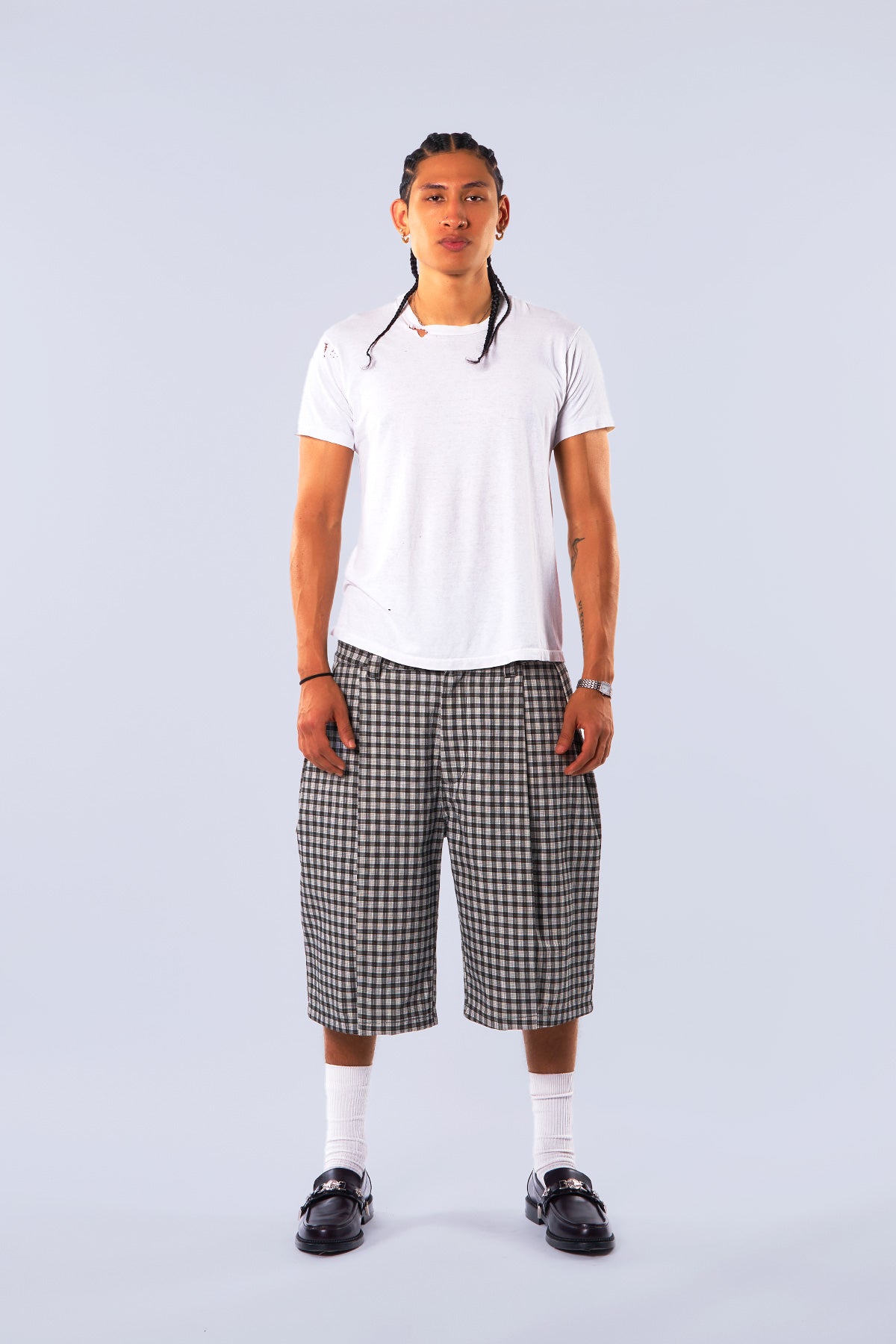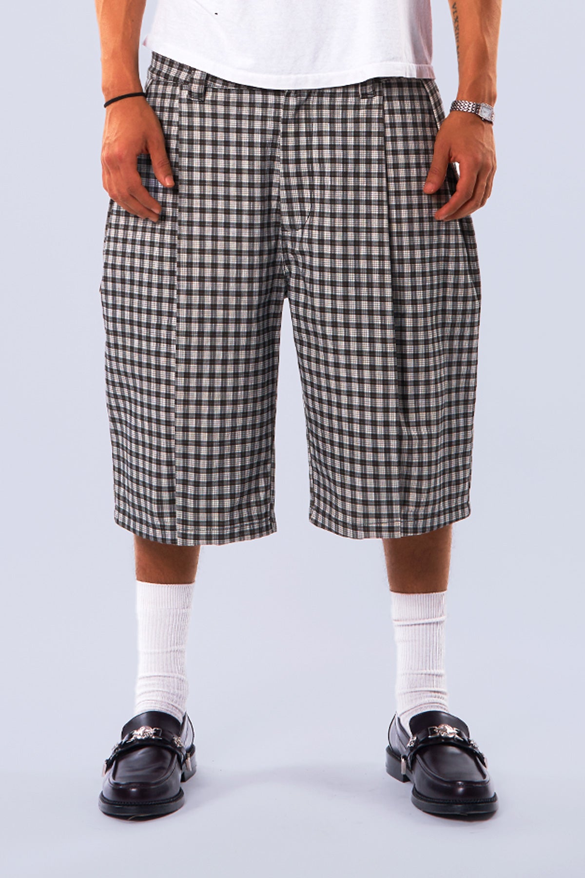 Midnight Canvas Pleated Plaid Denim Shorts