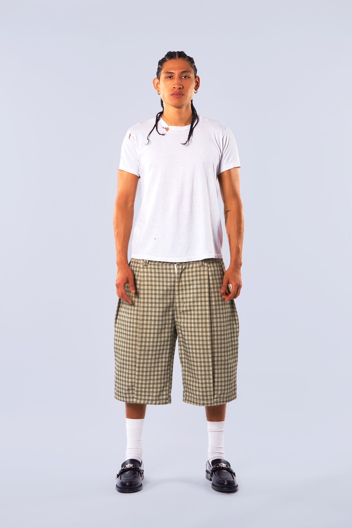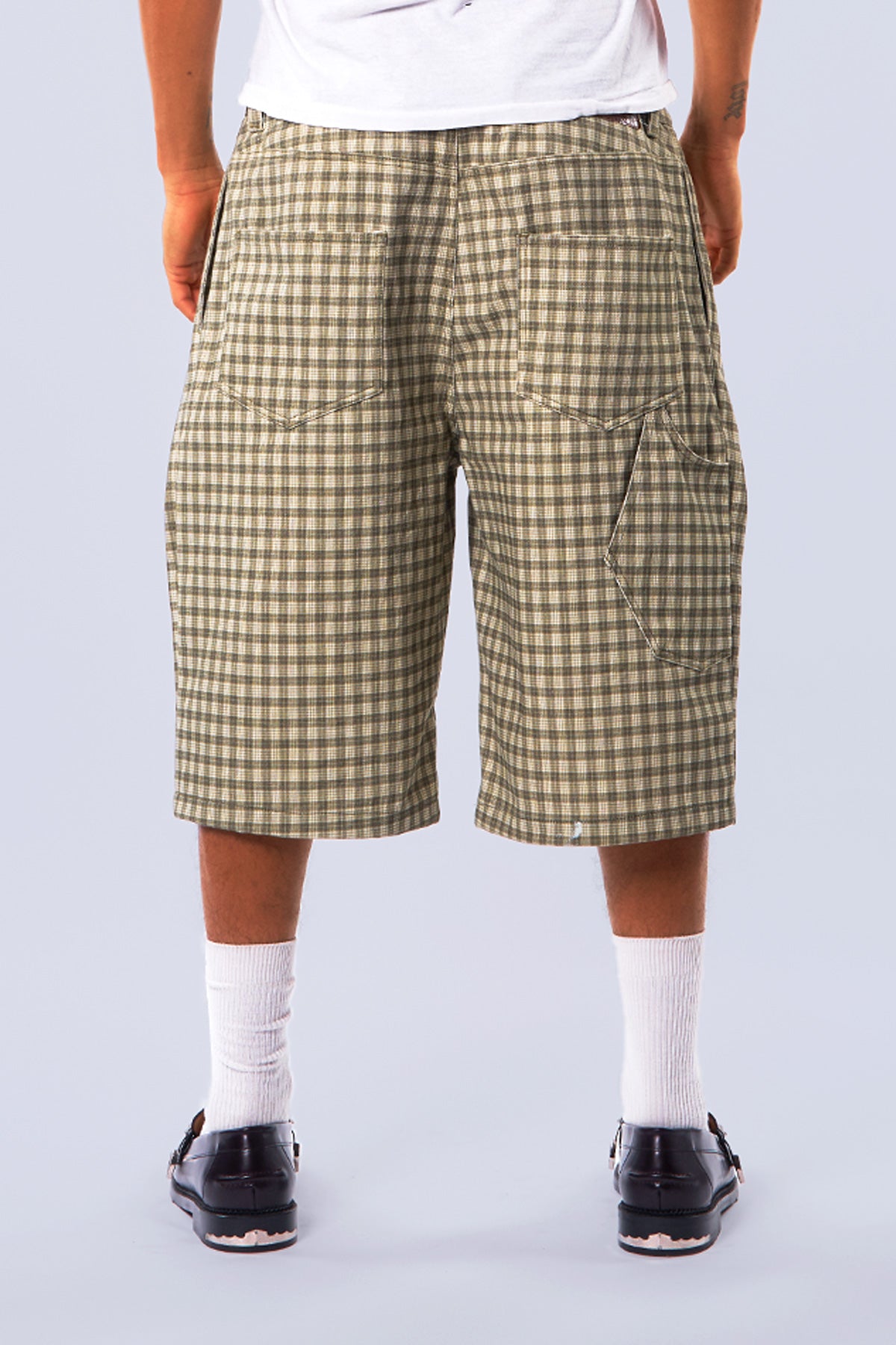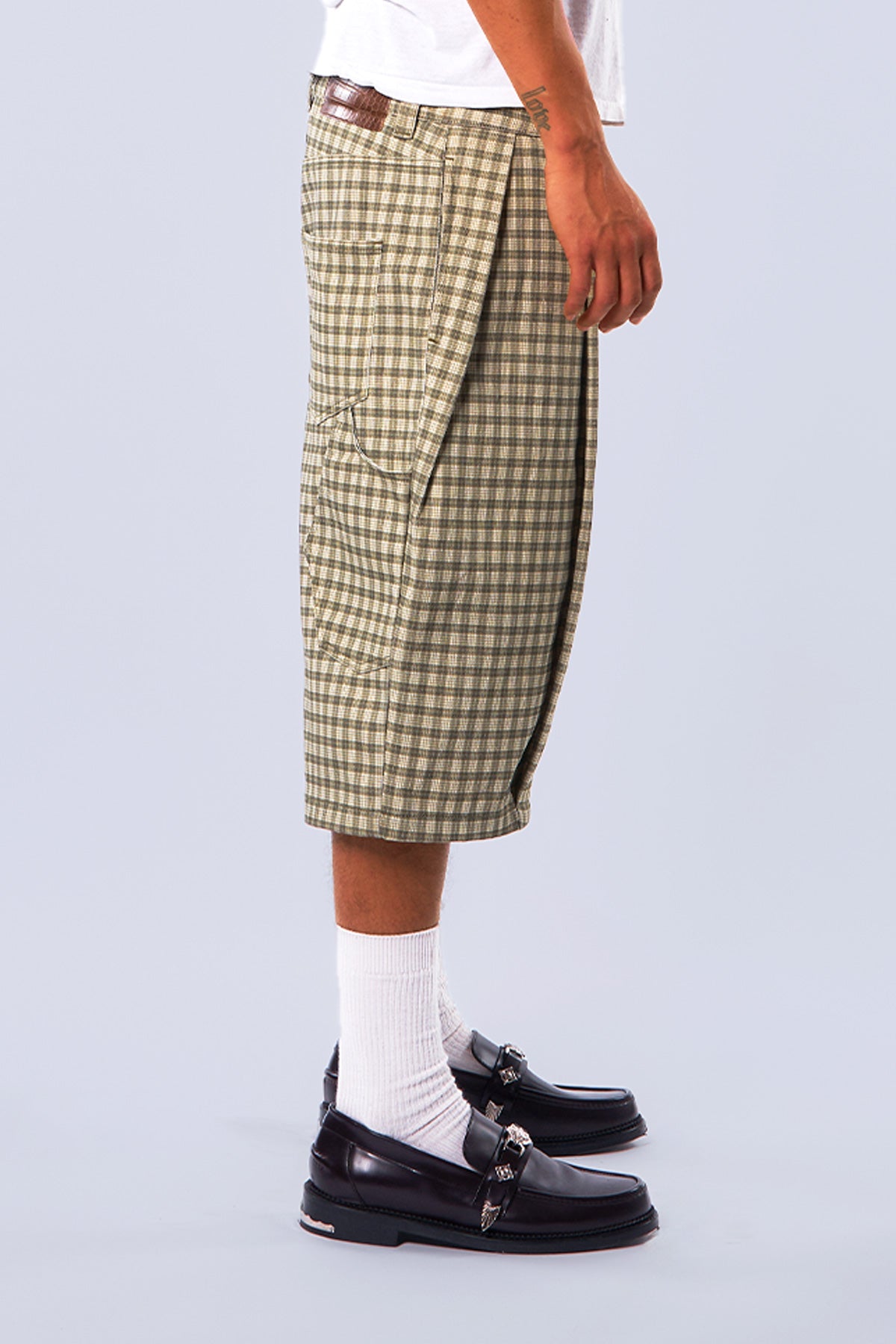 Canvas Green Pleated Plaid Denim Shorts